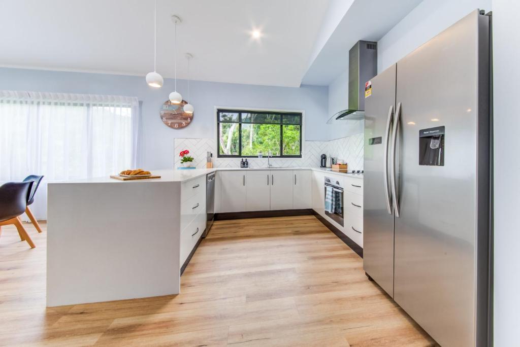 The location is on a hillside with a steep incline. The walk down to town is pleasant and takes about 10 minutes, but the return climb is challenging, particularly in summer heat. Most guests use taxis for the uphill return ($8-10). The property backs onto bushland, providing privacy and a natural setting. Dolce Gusto coffee pods can be purchased from the local Woolworths if you need extras.