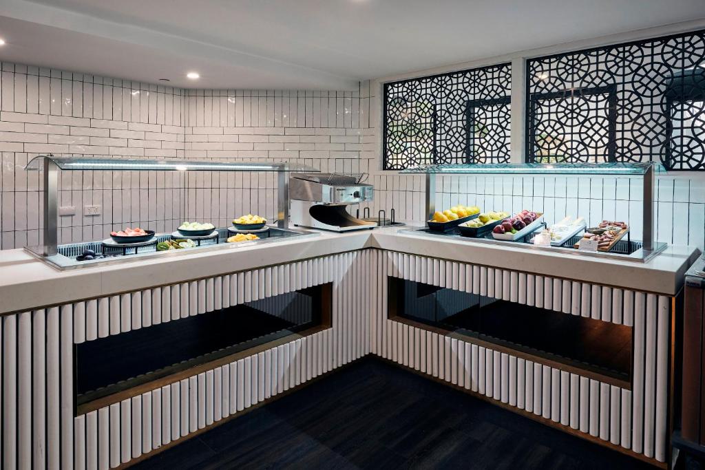 There are three main restaurants: Graze (buffet breakfast and selected dinner nights overlooking the Living Reef), Salti (Mediterranean-inspired fresh seafood and coastal cuisine for lunch and dinner), and Infinity (Asian fusion with stunning ocean views for dinner on selected nights). There's also Tonic Bar (specializing in gin), Barefoot Bar (swim-up pool bar), and Coffee Bean Café for barista coffee. The quality is good across the board - Salti gets particular praise - but some guests find the menus repetitive after 3+ nights. The breakfast buffet is very generous with hot foods, pastries, fresh fruit, and made-to-order omelettes. If you want more variety, you can catch the ferry to Airlie Beach for dinner and return on a later ferry, though most guests prefer to stay on the island once they've arrived.