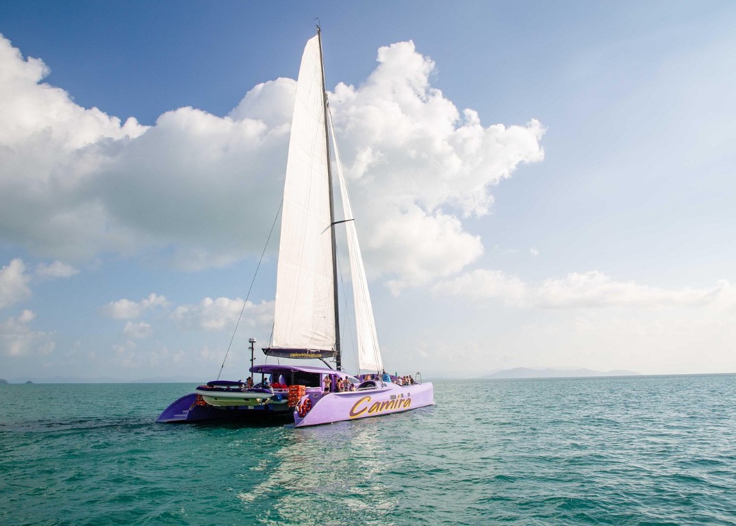 Camira is a high-speed sailing catamaran tour operated by Cruise Whitsundays, departing from Port of Airlie in Airlie Beach. The full-day sailing adventure visits Whitehaven Beach and Hill Inlet Lookout on Whitsunday Island, with snorkelling at protected fringing reef sites in the Whitsunday Islands Marine Park.