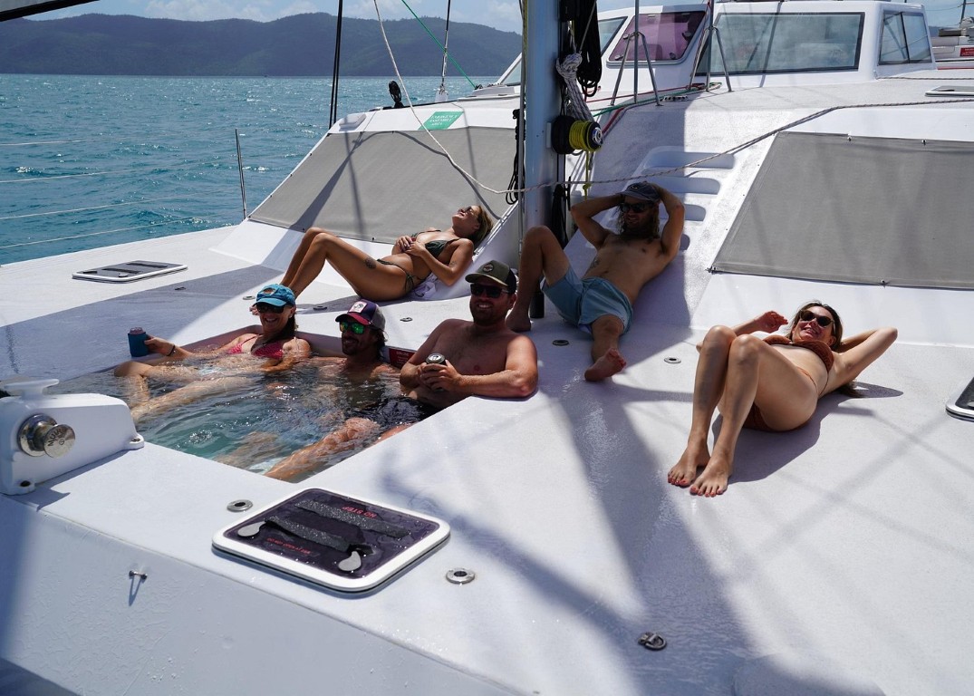 Small group size (max 29), private mooring at Langford Island, BYO drinks, air conditioning, foredeck jacuzzi, and genuine sailing experience.
