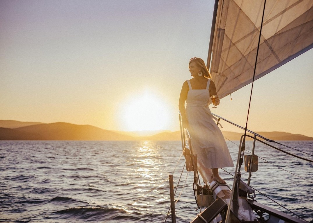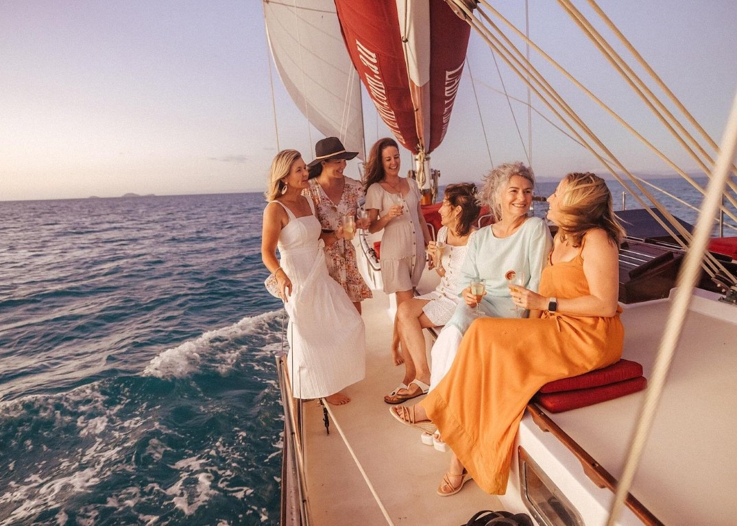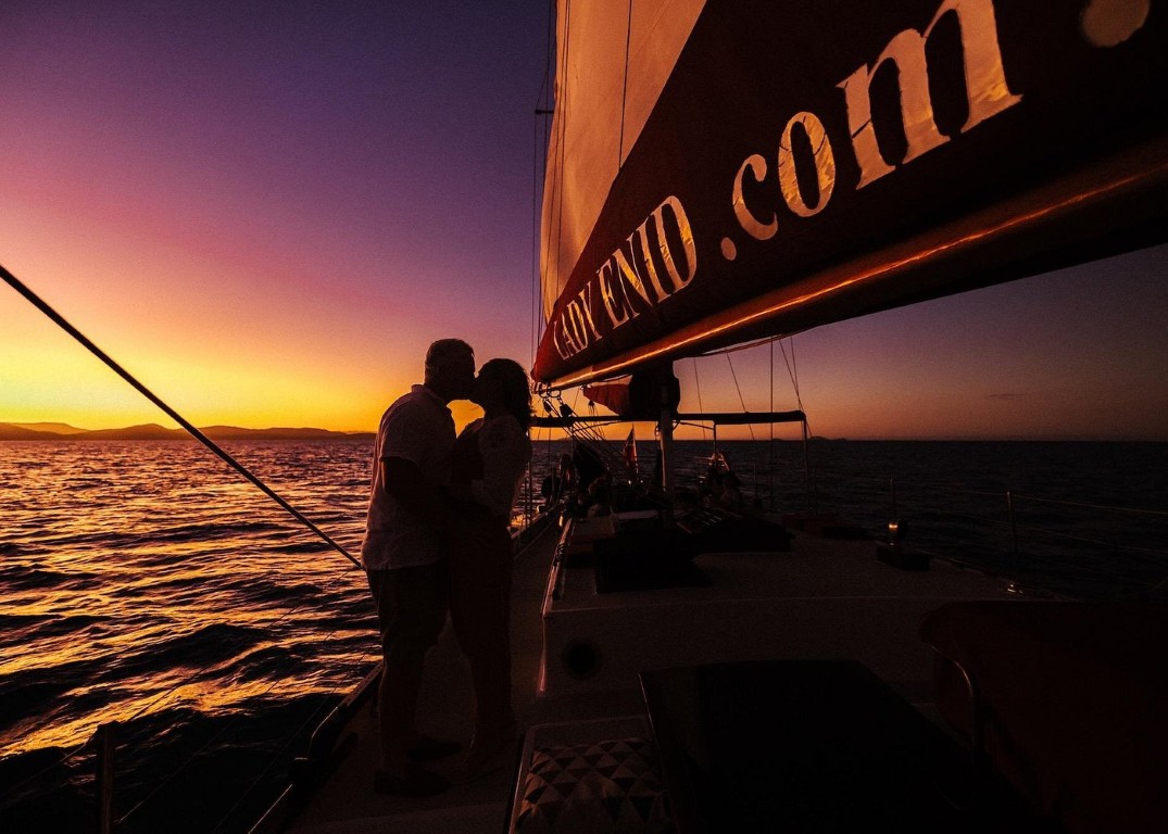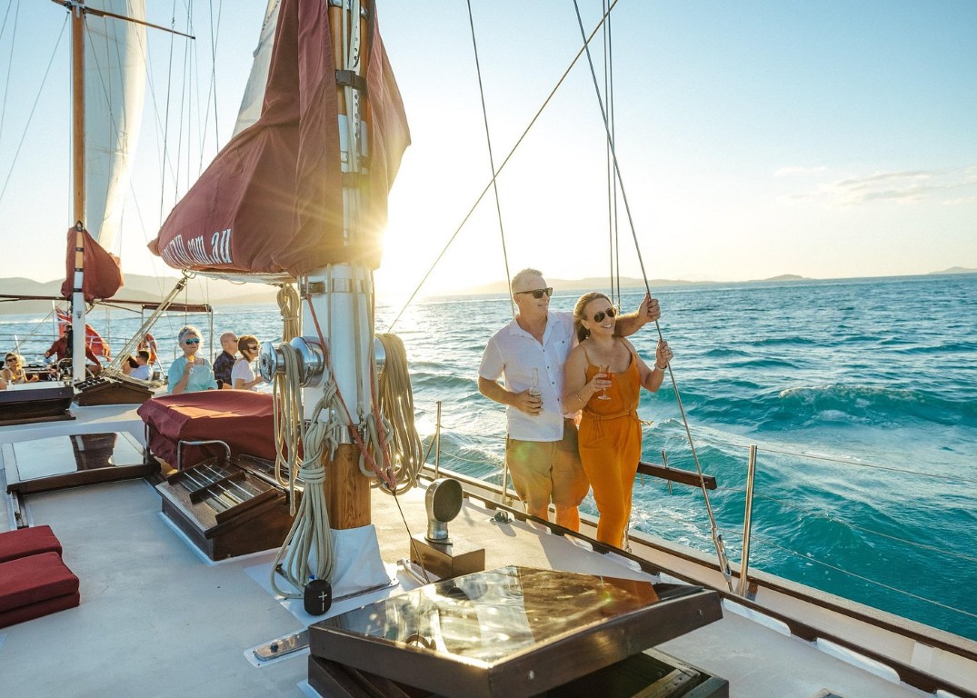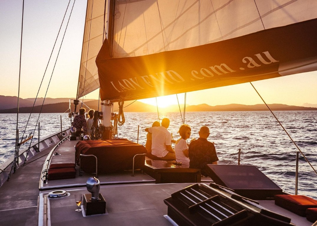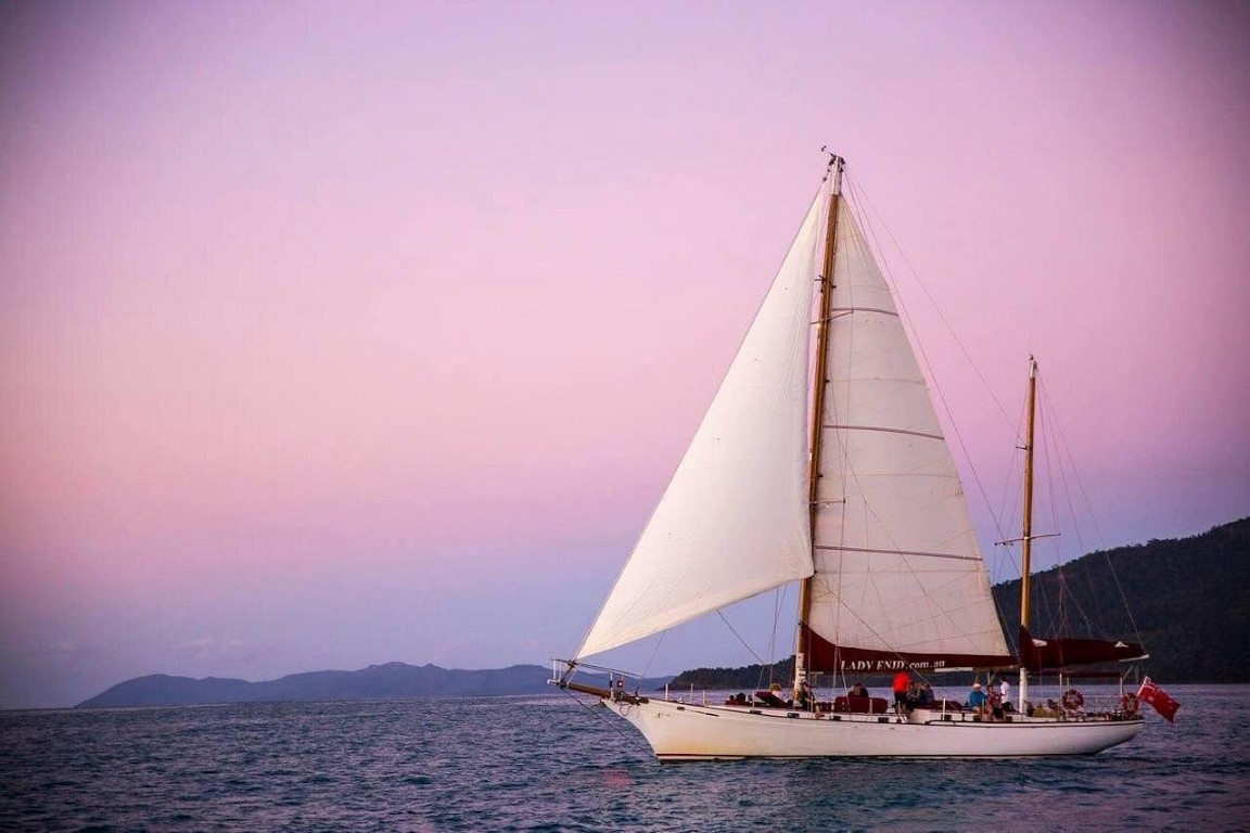 The Lady Enid Sunset Sail is a romantic sailing experience operated by Iconic Whitsunday Adventures, departing from Coral Sea Marina in Airlie Beach. The two-hour adults-only cruise sails around Pioneer Bay, offering stunning views of the coastline and the Whitsunday Islands as the sun sets over the mountains.
