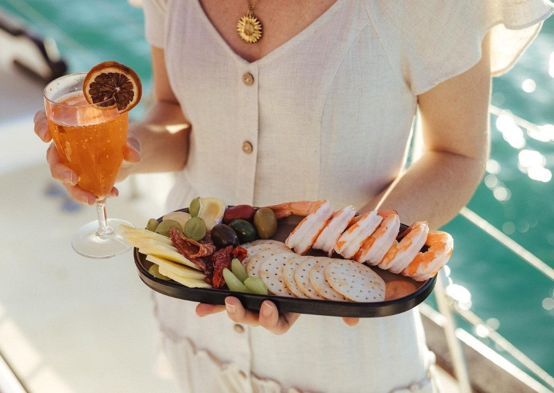 Welcome Aboard: Step onto Lady Enid and you'll immediately appreciate the craftsmanship of this beautiful timber yacht. The crew will show you around, point out where to stow your shoes and belongings, and hand you a welcome Aperol Spritz. The antipasto platter will be laid out - prawns, cheese, salami, crackers and olives to share.